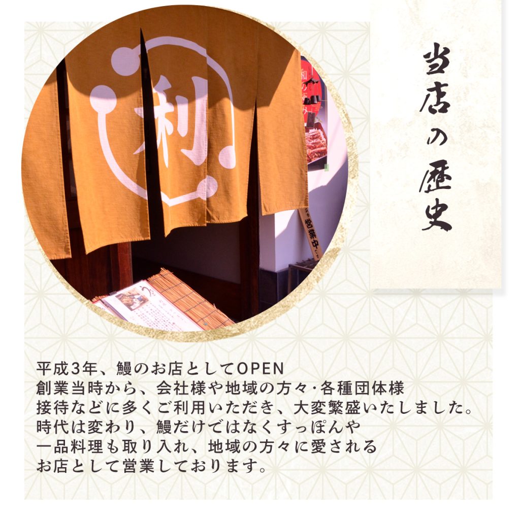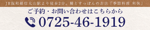 JR阪和線信太山駅より徒歩2分のところにある、鰻とすっぽんのお店「季節料理 利休」