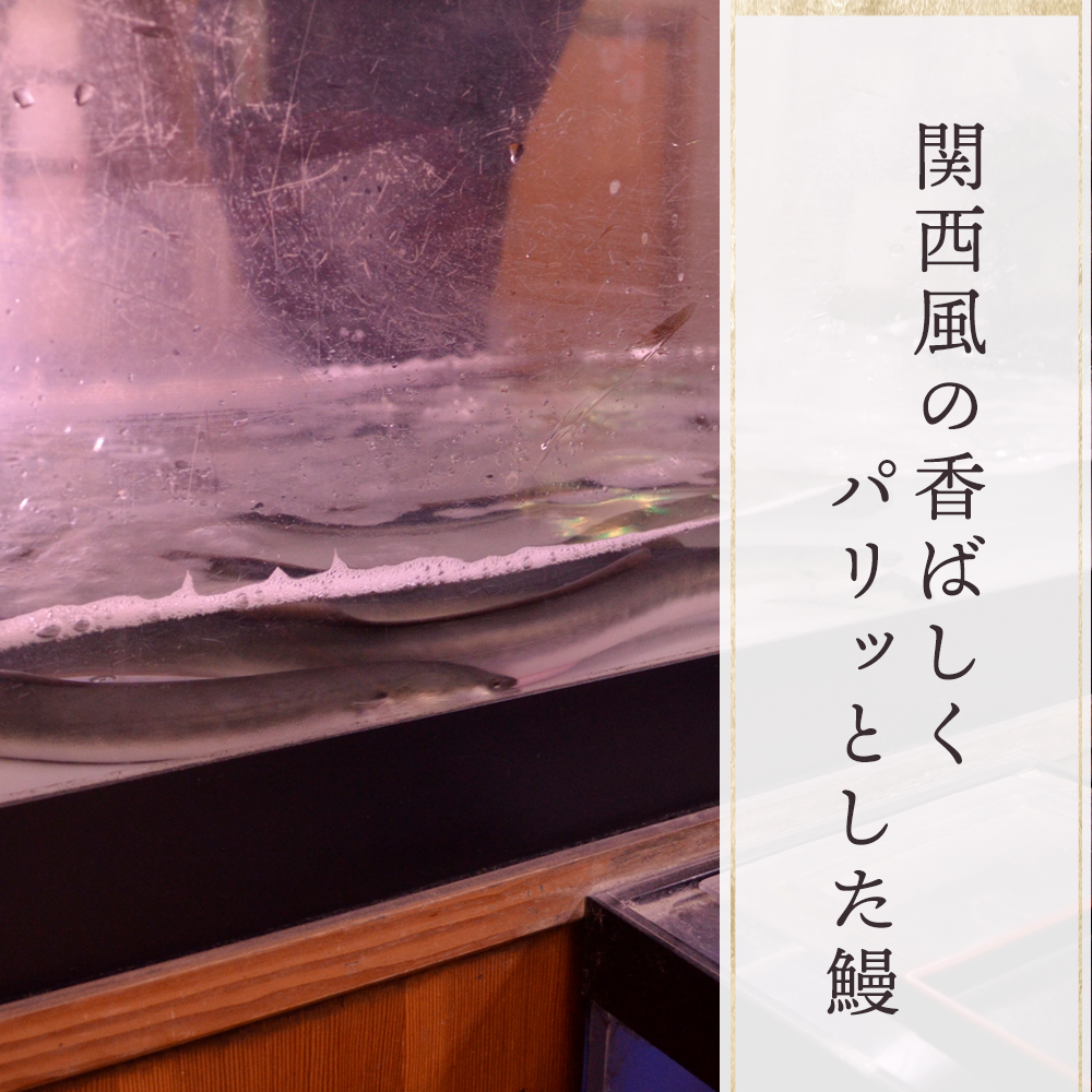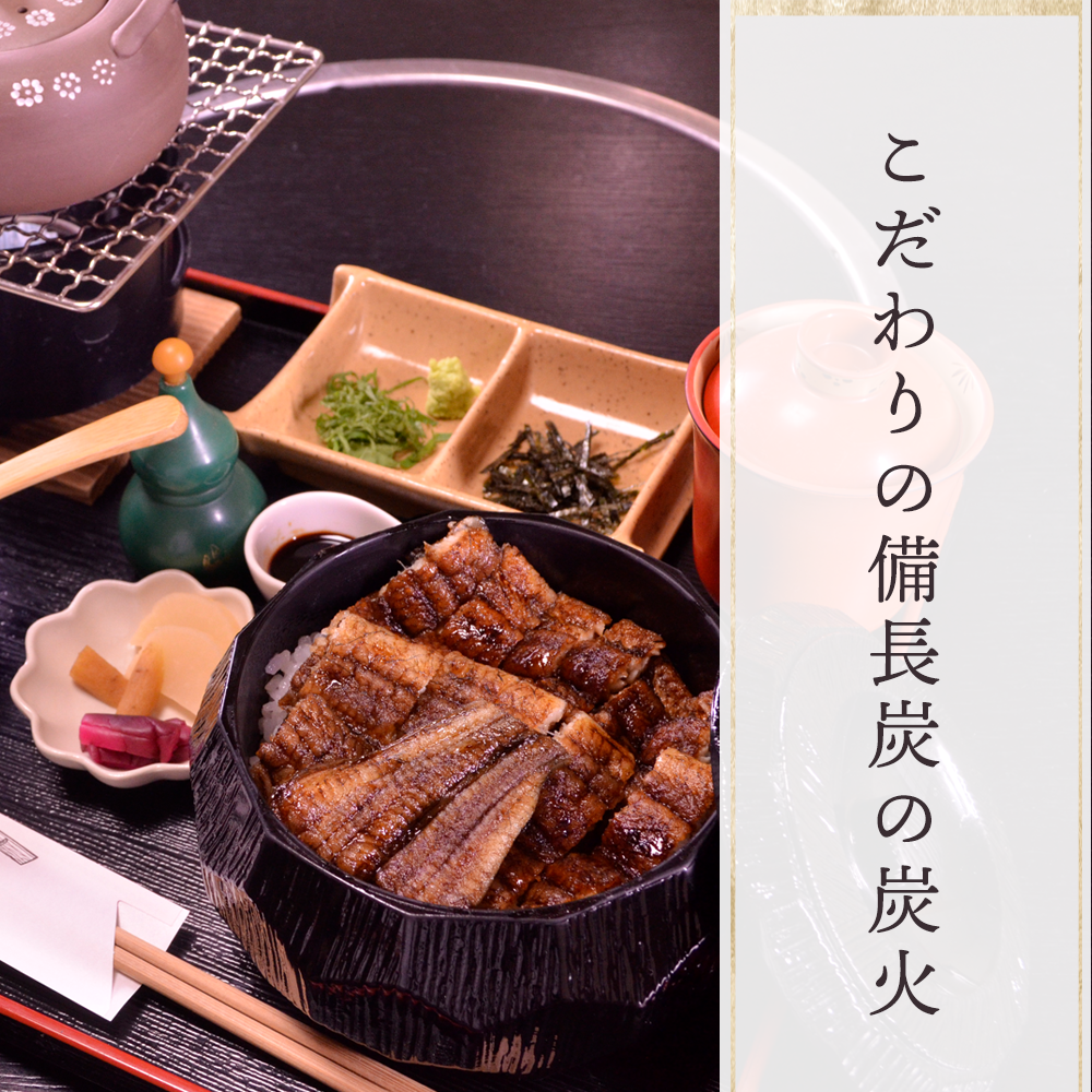 店主こだわりの鰻は、備長炭の炭火で焼いています。水槽で泳いでいる活きた鰻を氷で締めます。そこから捌き、串を打って炭火で焼きあげます。関西風の、香ばしくパリッとした鰻は、中はトロッとジューシー!やはり新鮮な鰻はお味が違います!当店の鰻料理はご注文をいただいてから捌いて丁寧に焼き上げておりますので、お召し上がりいただくまでに少しお時間がかかってしまいますが、ご了承ください。